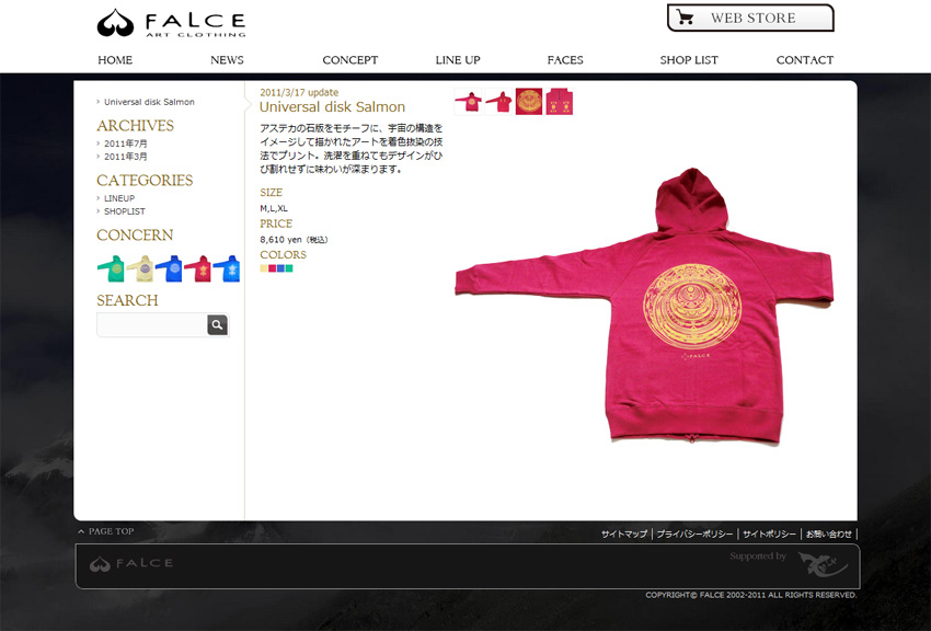 アパレルブランドFALCE ART CLOTING [ファルス アートクロージング]WEBサイトを制作させて頂きました。ブラウザ幅に合わせ可変するリキッドレイアウトをトップページに採用。またスマートフォンにも対応し、各キャリア(iPhone/Android)を識別し専用ページを表示します。ギャラリーはフリック系の動作にも対応。CMS(ブログシステム)で一括して更新が可能となっています。